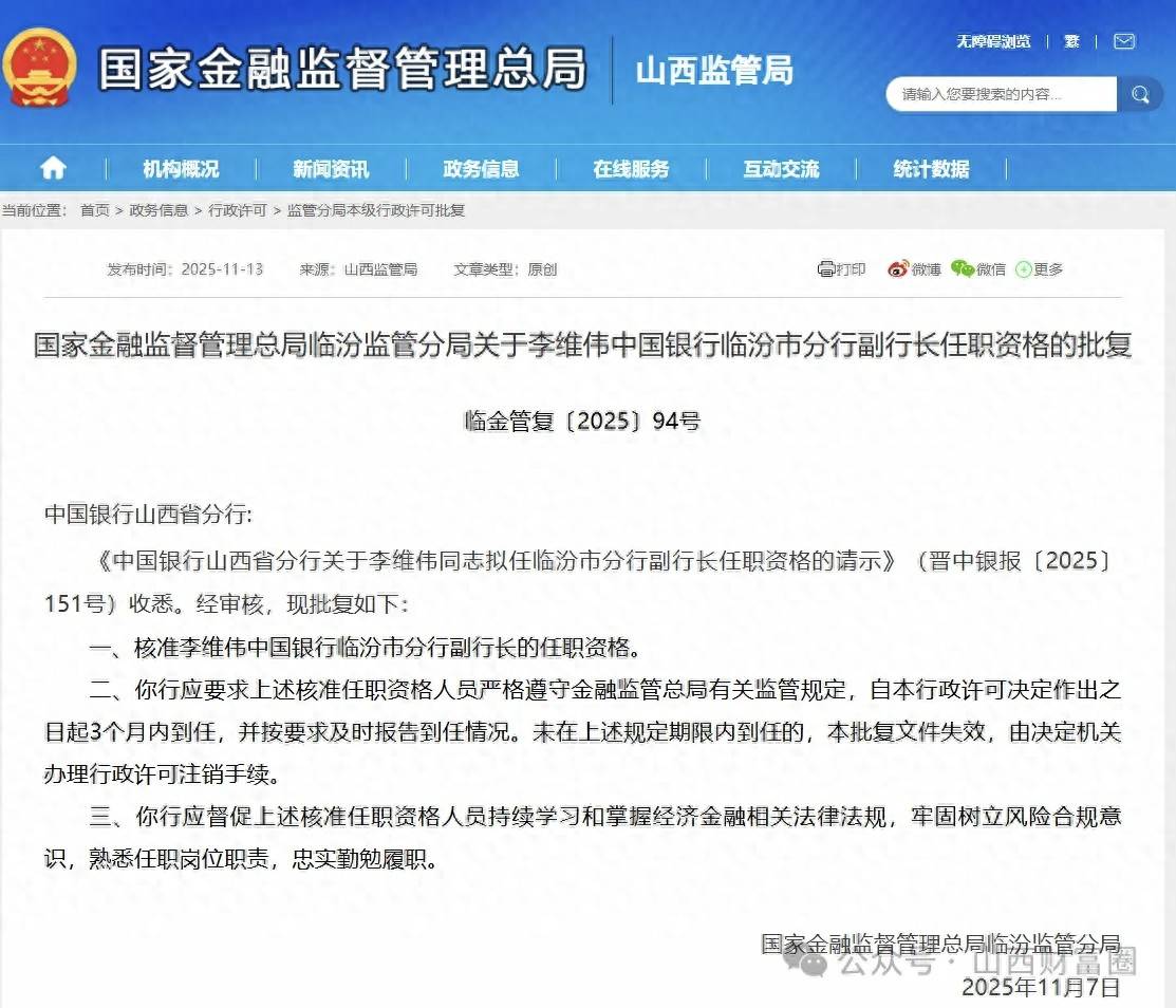 近日,国家金融监督管理总局山西监管局集中对外公示最新相关高管任职资格批复。