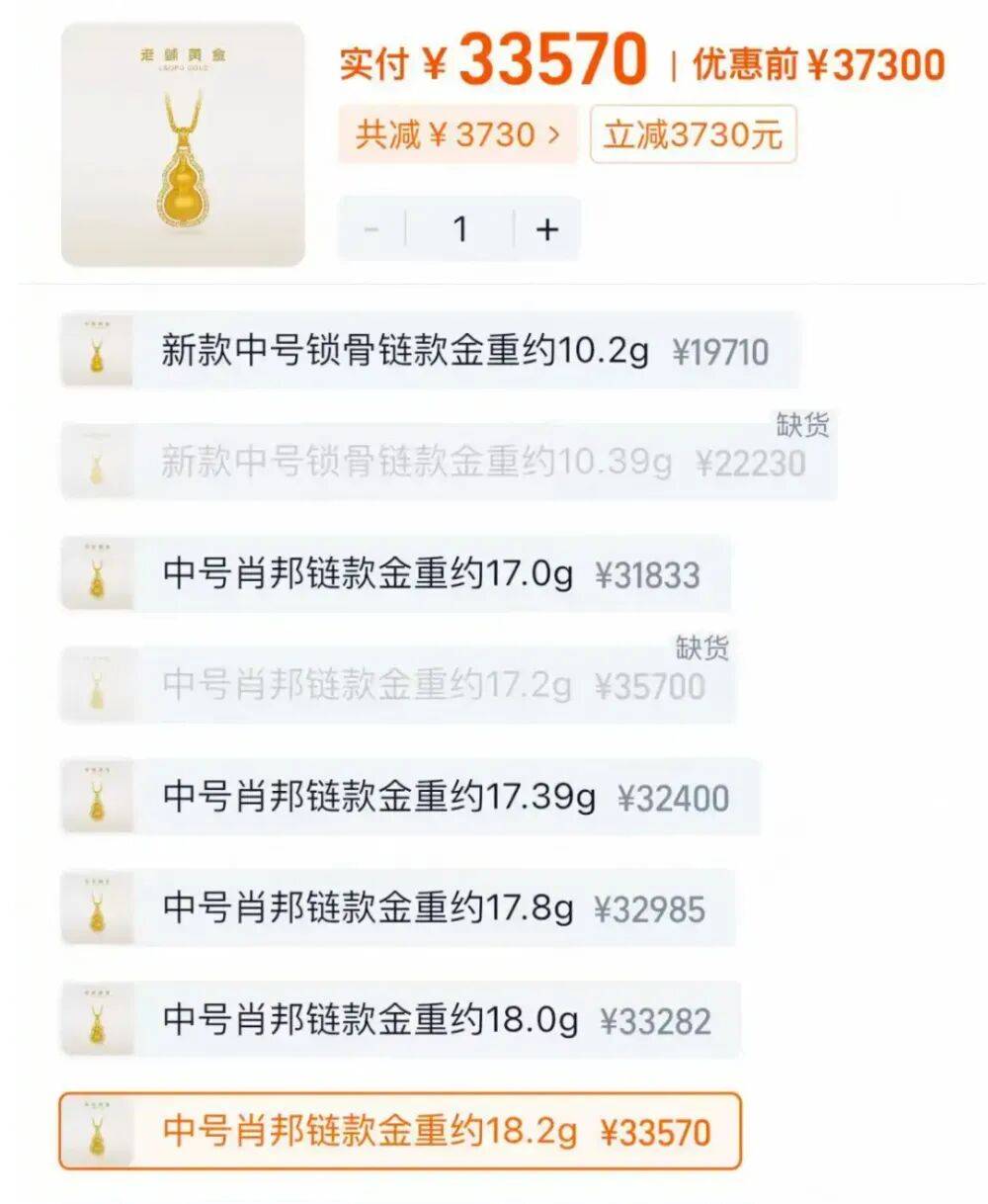 就在刚刚过去的双十一期间,老铺黄金的一款18.2克的金葫芦吊坠,售价从30000元涨到了33570元。