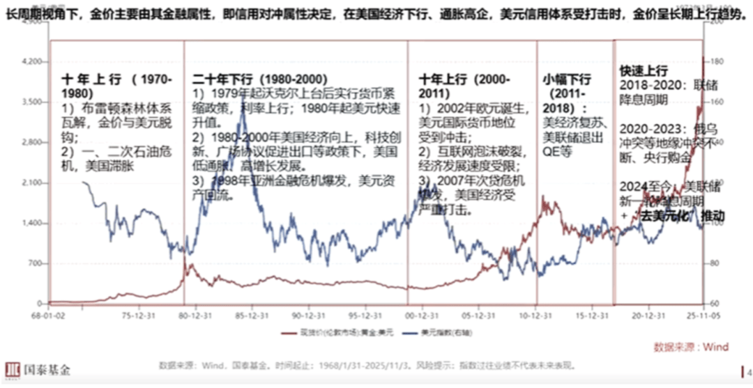 我们可以看一下黄金过往的走势,有一张图是从1968年到2025年,可以非常明显的看到金价跟美元的走势是一个反向关系。当然中间偶尔有一两年它可能也是成正向的关系,但是大体上来说还是成反向的关系。这两年黄金虽然和美元依然是一个反向关系,但是有个很有意思的现象,就是美元并没有出现大幅下跌的情况下,黄金上涨的斜率非常高。所以,这里边一定发生了一些和以前不一样的地方。
