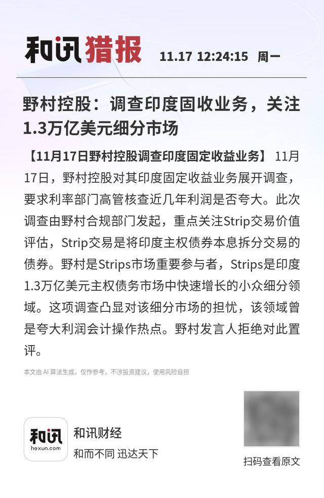 【11月17日野村控股调查印度固定收益业务】11月17日,野村控股对其印度固定收益业务展开调查,要求利率部门高管核查近几年利润是否夸大。此次调查由野村合规部门发起,重点关注Strip交易价值评估,Strip交易是将印度主权债券本息拆分交易的债券。野村是Strips市场重要参与者,Strips是印度1.3万亿美元主权债务市场中快速增长的小众细分领域。这项调查凸显对该细分市场的担忧,该领域曾是夸大利润会计操作热点。野村发言人拒绝对此置评。