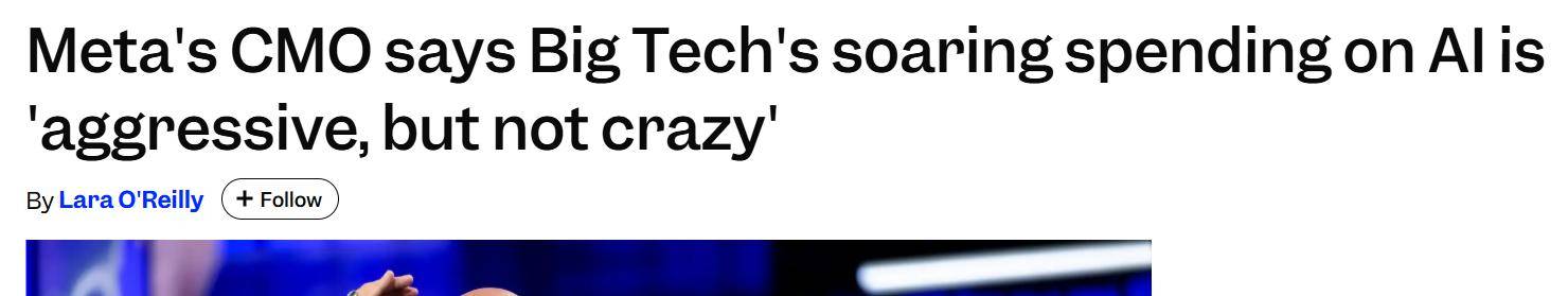 针对“Meta公司以及硅谷其他公司是否在人工智能领域投入过多资金”的问题,Meta首席营销官兼分析副总裁亚历克斯·舒尔茨近日在接受采访时表示:“显然,任何 Meta 高管都不会对这个问题回答‘是’。”