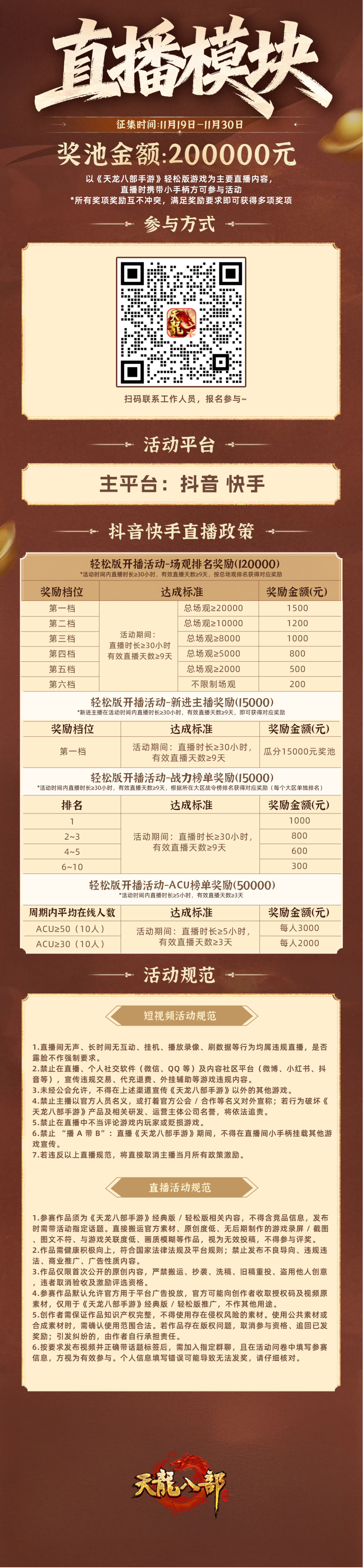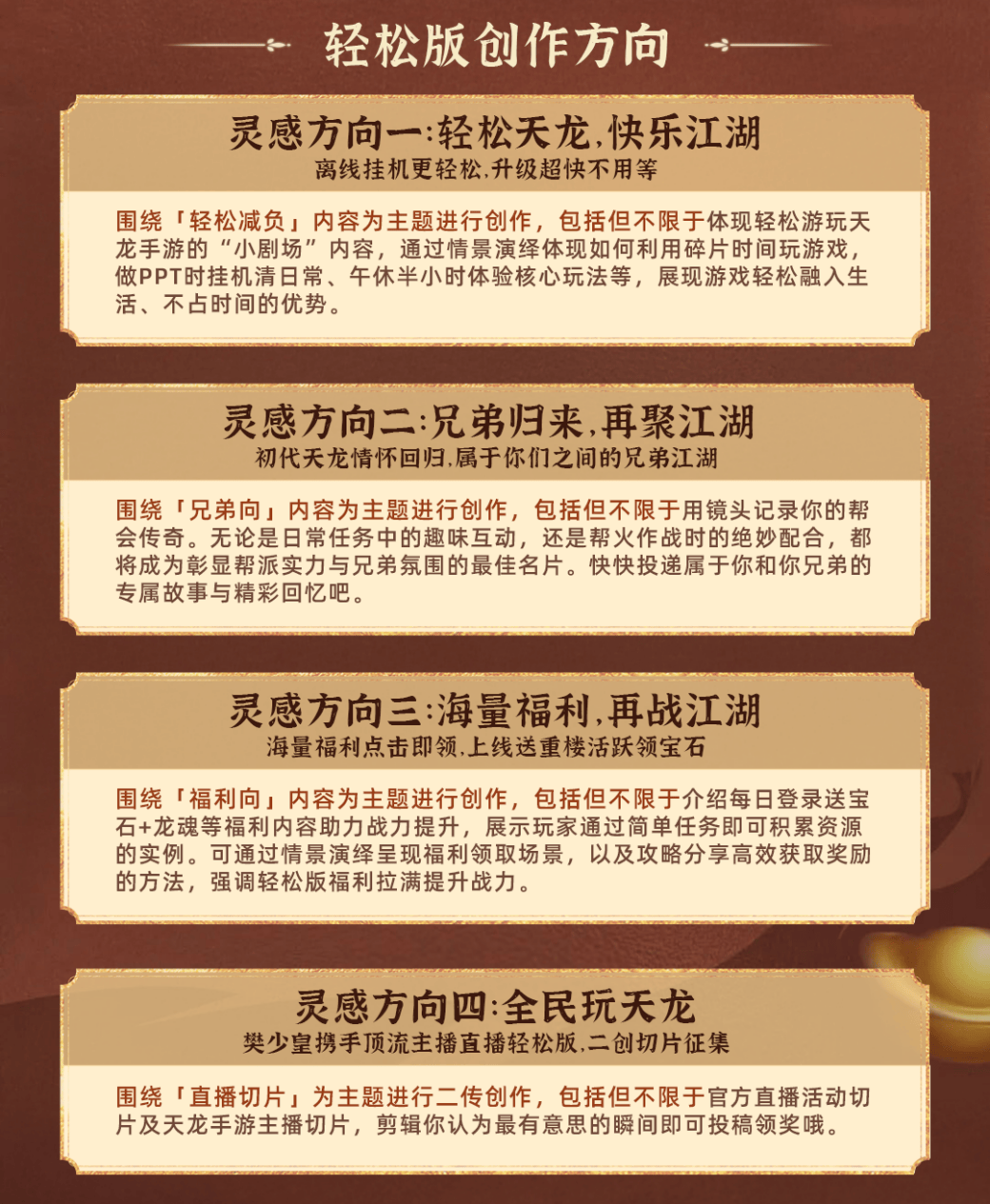 从即日至11月30日,天龙八部手游轻松版激励计划正式开启!无论少侠是天龙资深创作者,还是对活动感兴趣的围观群众,只要你有热情、有想法,这里就有你发光的机会。