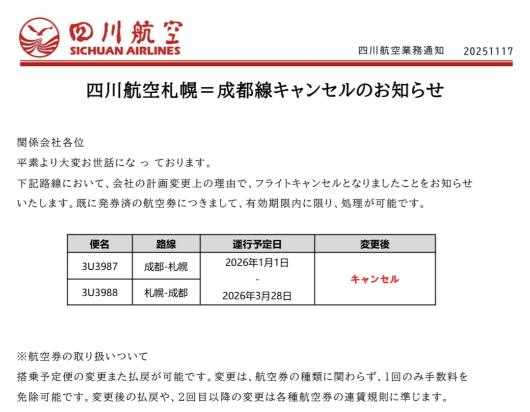 四川航空于17日发布通知,取消2026年1月1日至3月28日的成都至日本札幌航线。