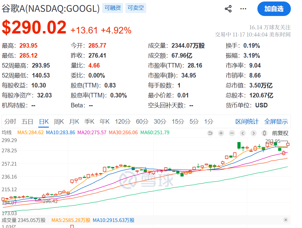 谷歌盘中涨幅一度扩大至接近6%,市值突破3.5万亿美元,再创历史新高。消息面上,此前巴菲特旗下伯克希尔·哈撒韦披露已经重仓买入这家公司股份。尽管此次买入很可能并非巴菲特本人直接做出的决策,而是由他的两位股票投资经理之一执行。但投资者从中得到鼓舞,认为在今年股价大涨之后,伯克希尔仍然认为这只AI概念股具有投资价值。这也是该集团多年来在科技领域最重要的一笔押注之一。