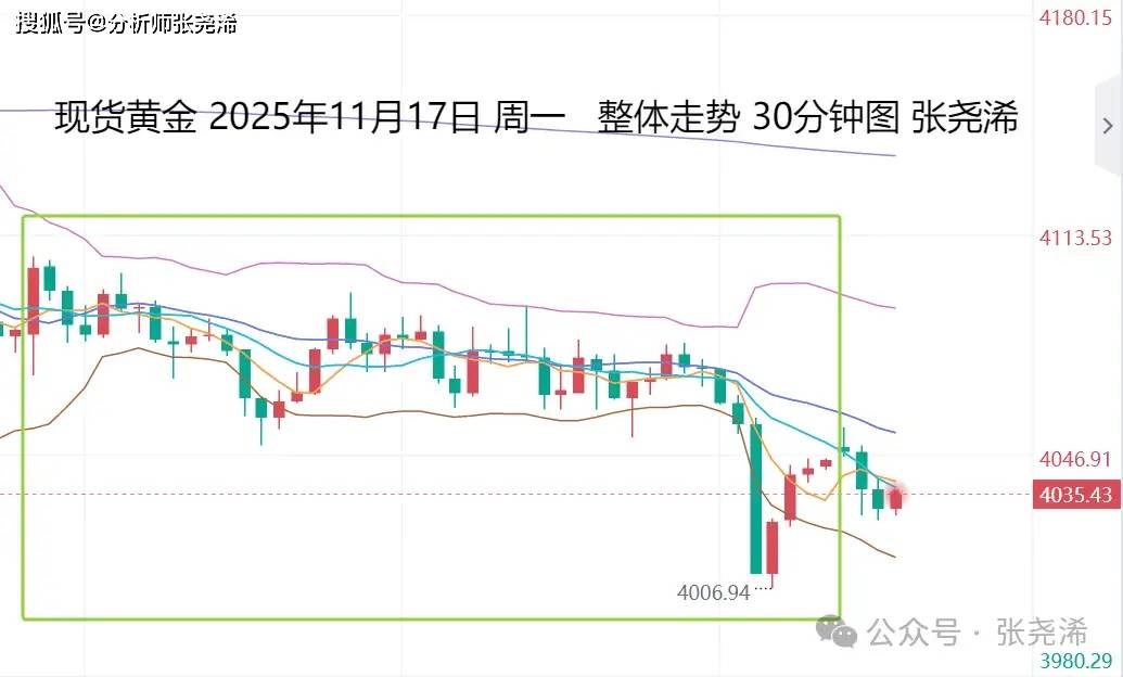 上交易日周一(11月17日):国际黄金触底回升式收跌,美联储“二把手”重申降息需谨慎等,令其12月降息概率大降,打压金价继续走低,虽由于支撑买盘,以及美联储理事沃勒支持12月降息,虽收线有一定的止跌看涨的预期形态,但指标信号也未显示出回落触底预期,并且当下利好因素减弱,本周数据等预期也偏向利空金价,故此,本周整体走势依然还是偏向震荡调整为主。