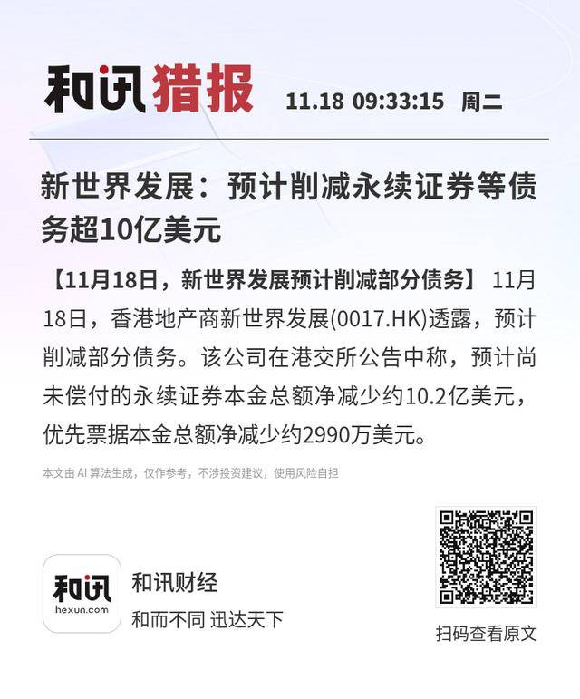 【11月18日,新世界发展预计削减部分债务】11月18日,香港地产商新世界发展(0017.HK)透露,预计削减部分债务。该公司在港交所公告中称,预计尚未偿付的永续证券本金总额净减少约10.2亿美元,优先票据本金总额净减少约2990万美元。