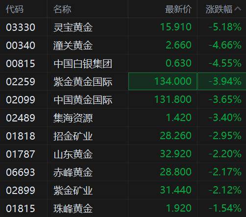 港股异动丨黄金股继续弱势 现货黄金跌破4020美元
