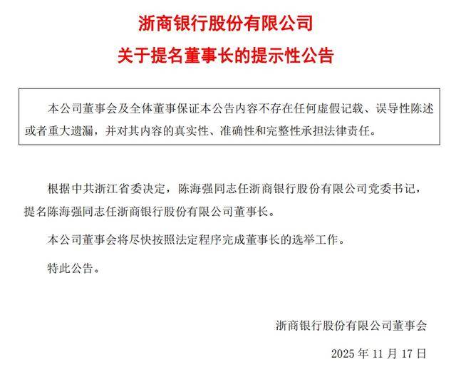 根据浙商银行此前发布的公告,陈海强生于1974年10月,硕士学位、正高级经济师。