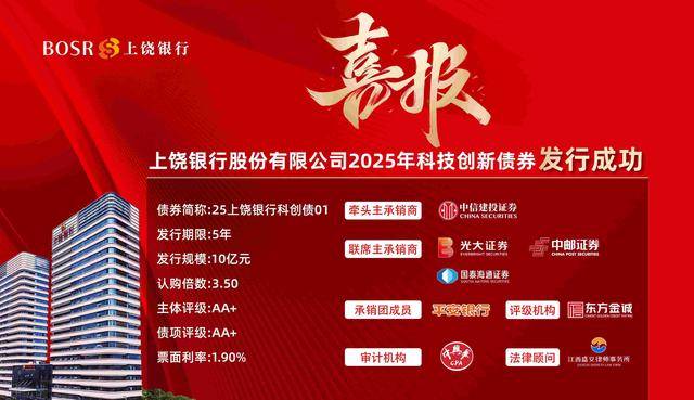 11月17日,上饶银行成功簿记发行科技创新债券。本期债券发行规模10亿元,期限5年,票面利率1.90%,获得了商业银行、证券公司、基金公司等多元投资者的踊跃认购,全场认购倍数超过3倍。募集资金将依据适用法律和监管部门批复,专项用于支持科技创新领域相关业务。