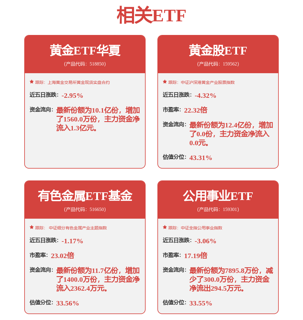 受隔夜 COMEX黄金期货价格止跌反弹影响,11月19日,黄金相关ETF产品纷纷移动上涨,截至9:52,黄金ETF华夏(518850)涨0.95%,有色金属ETF基金(516650)涨1.19%,黄金股ETF(159562)涨1.38%, 其持仓股中国黄金国际、周大福、招金矿业、紫金矿业等股纷纷走强。