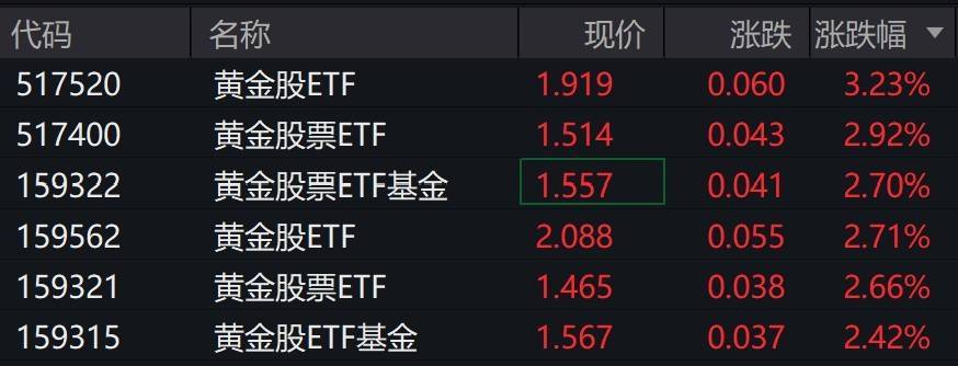 受盘面影响,黄金股相关ETF涨超2%。