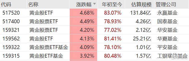 黄金股持续走强,中金黄金触及涨停,晓程科技、赤峰黄金、兴业银锡、山东黄金、山金国际均涨超5%,带动黄金股ETF、黄金股票ETF、黄金股票ETF基金、黄金股ETF基金涨超4%。