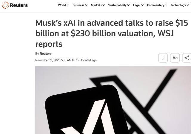 【环球网科技综合报道】11月19日消息,据路透社援引《华尔街日报》报道称,埃隆·马斯克旗下人工智能公司xAI正就新一轮股权融资与投资者深入谈判,计划募集150亿美元,估值高达2300亿美元。该估值较3月与X平台合并时公布的1130亿美元翻倍有余。
