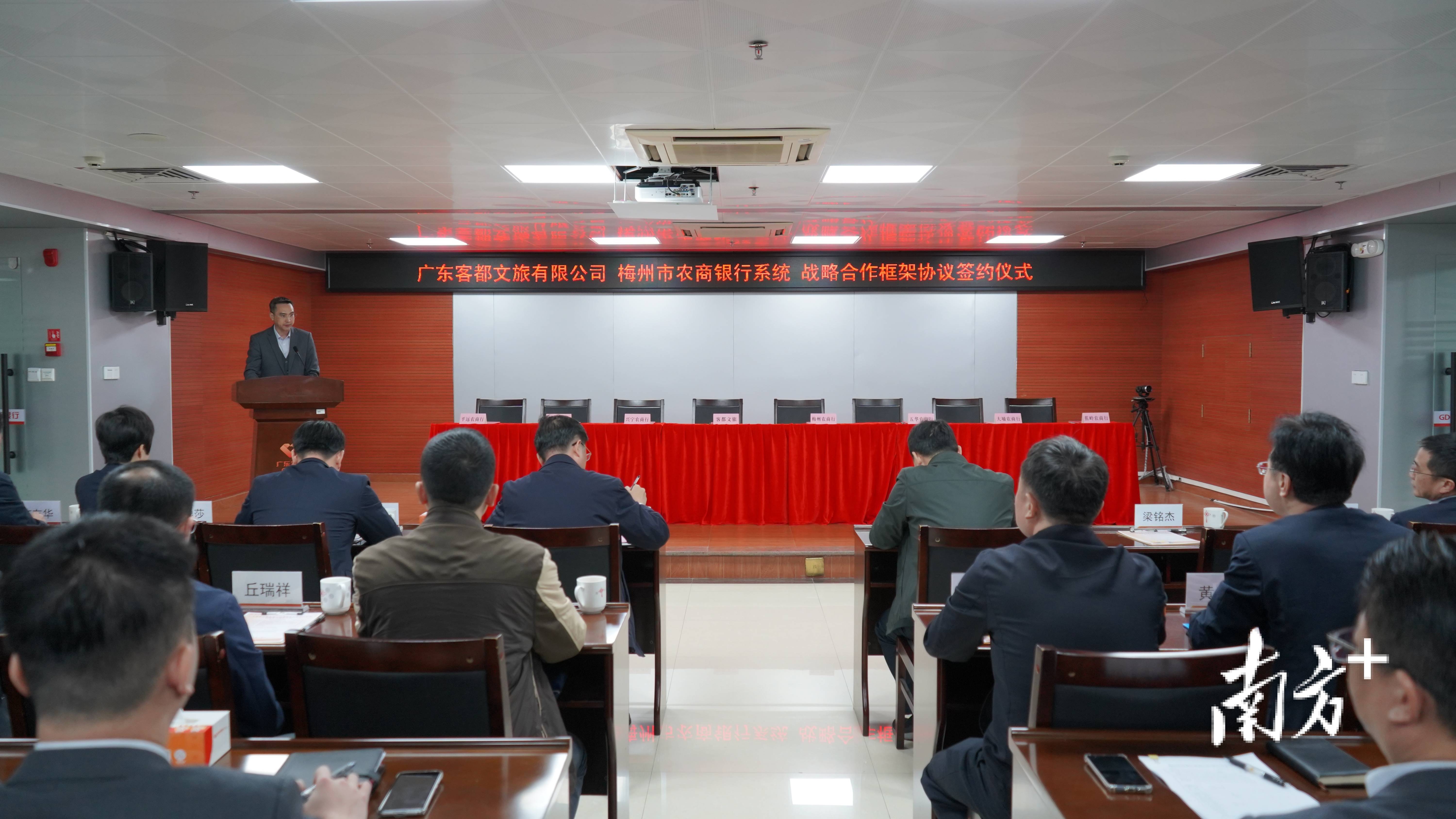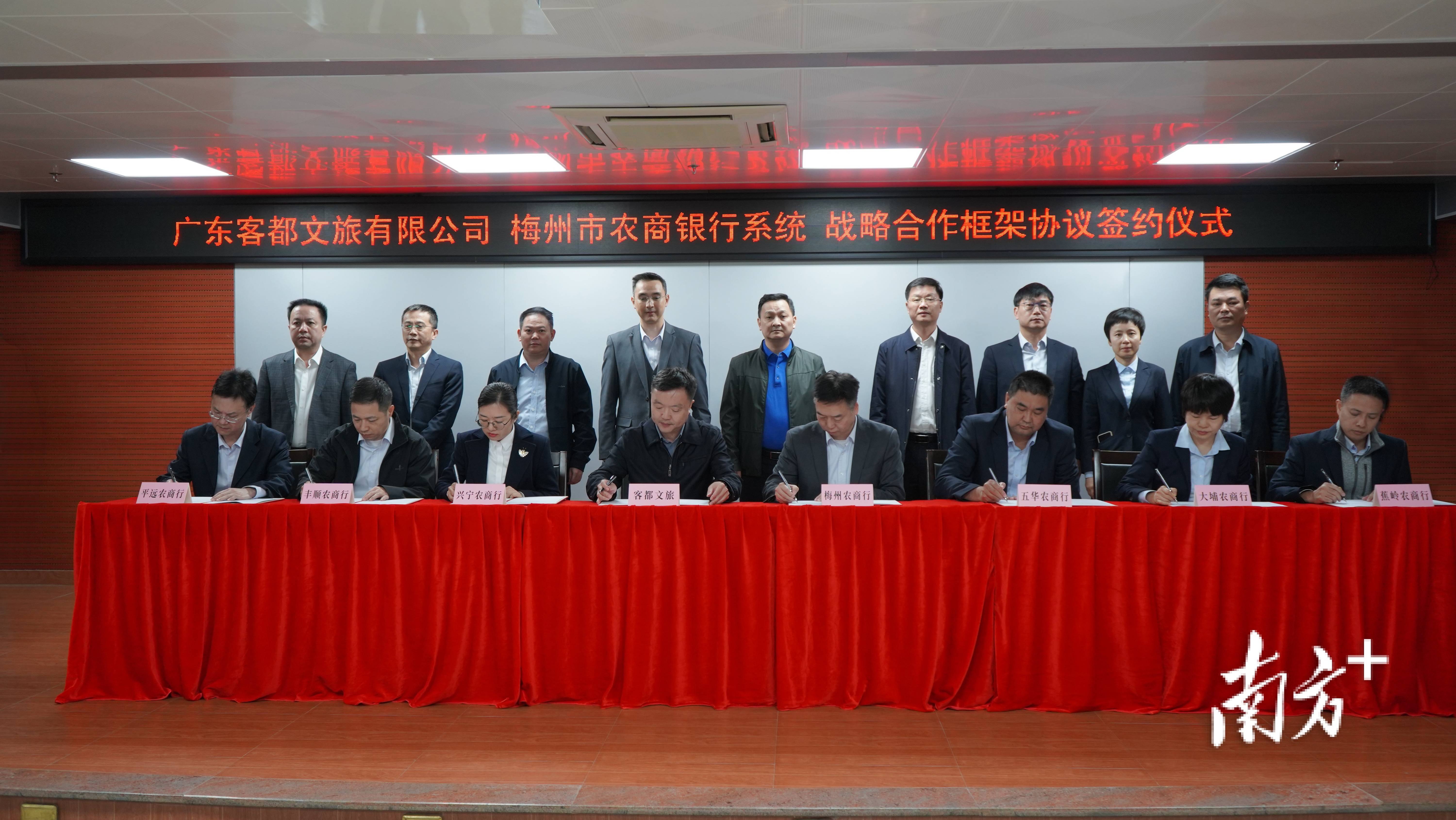 11月18日,梅州农商银行联合辖内其他农商银行与广东客都文旅有限公司举行战略合作框架协议签约仪式。梅州市国资委党委书记、主任丘孝东,广东客都文旅有限公司党委书记、董事长陈远航,梅州农商银行党委书记、董事长梁铭杰,以及辖内其他农商银行负责人等参加仪式。