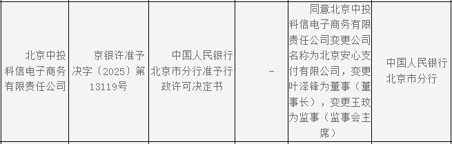中国人民银行北京市分行非银行支付机构重大事项变更许可信息公示(2025年11月14日)显示,同意北京中投科信电子商务有限责任公司(下称“中投科信”)变更公司名称为北京安心支付有限公司,变更叶泽锋为董事(董事长),变更王玟为监事(监事会主席)。