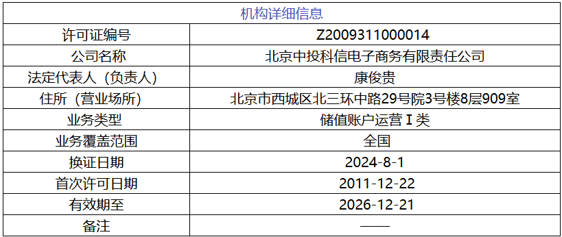 据了解,中投科信成立于2012年,注册资金1.11亿。中投科信2011年获得央行首批颁发的《支付业务许可证》并于2016年、2021年两次成功续展支付牌照,业务类型为互联网支付(全国)。随着支付业务类型重新划分,其业务类型已变更为“储值账户运营Ⅰ类”。