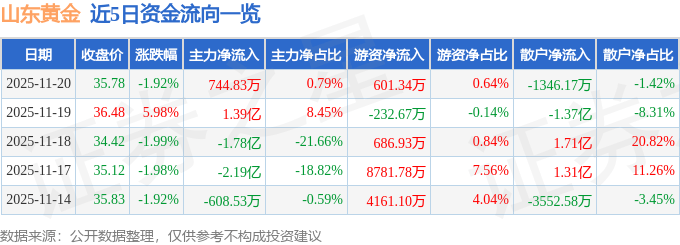 证券之星消息,截至2025年11月20日收盘,山东黄金(600547)报收于35.78元,下跌1.92%,换手率0.73%,成交量26.21万手,成交额9.46亿元。