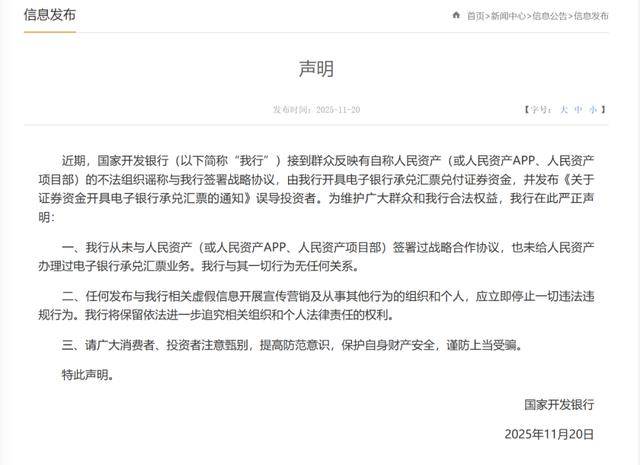 声明显示,该行近期接到群众反映,有自称人民资产(或人民资产APP、人民资产项目部)的不法组织谣称与国开行签署战略协议,由国开行开具电子银行承兑汇票兑付证券资金,并发布《关于证券资金开具电子银行承兑汇票的通知》误导投资者。