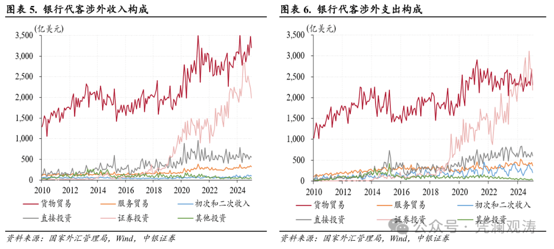 当月,直接投资、收益和经常转移、服务贸易涉外收付款逆差环比分别减少68亿、66亿和55亿美元,均由涉外支出规模季节性回落所致。需要指出的是,服务贸易涉外收付款逆差降至49亿美元,为2023年3月以来新低,即便考虑了上月,近两个月逆差均值为77亿美元,仍然是近三年以来同期新低,表明居民跨境出行需求或有所减少。