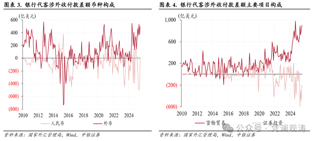 分币种看,人民币涉外收付款时隔四个月重回顺差16亿美元,环比增加414亿美元,外币涉外收付款顺差环比增加128亿至496亿美元,历史排名第五,且为年内次高,二者分别贡献了银行代客涉外收付款顺差增幅的76%、24%(见图表3)。