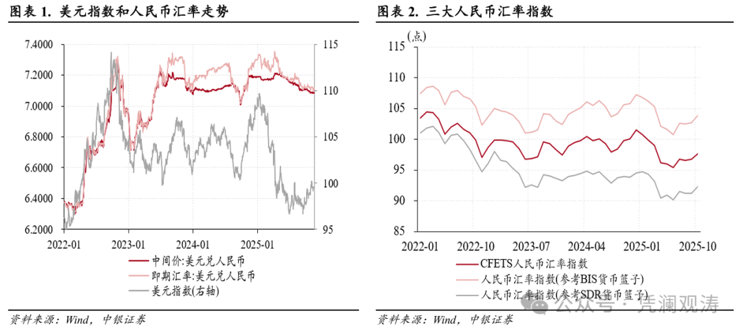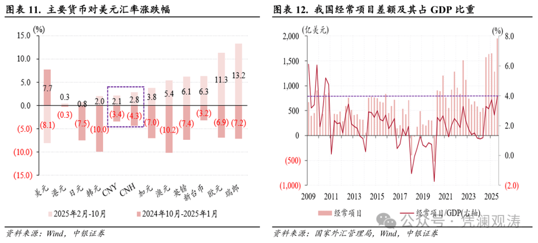 今年2月至10月,美元指数累计下跌8.1%,境内外人民币汇率升值幅度不足3%,小于其他主要非美货币涨幅,因此人民币多边汇率指数总体趋于下行(见图表11)。与此同时,面对特朗普关税冲击,中国出口展现出较强韧性。在此背景下,近期外围市场重现“人民币汇率低估论”,认为人民币对美元汇率保持基本稳定带来的人民币实际汇率下行,会扩大中国对外贸易顺差,加剧中国与世界其他地区的贸易摩擦。他们以平息贸易保护主义浪潮为由,呼吁人民币大幅升值[3]。