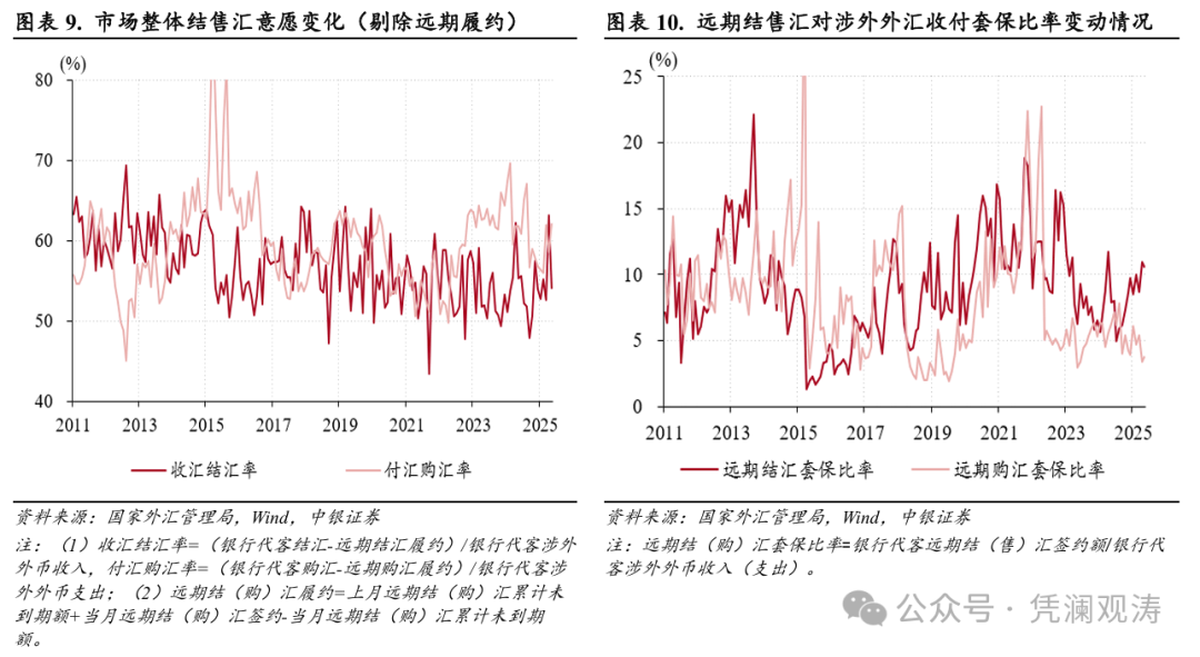 10月份,远期结汇签约额环比减少47亿美元,叠加远期购汇履约额减少37亿美元,使得银行代客远期净结汇累计未到期额增幅由上月150亿降至73亿美元,贡献了银行结售汇顺差规模降幅的17%(见图表7)。当月,市场主体远期结售汇意愿基本稳定,其中远期结汇和购汇套保比率环比分别回落0.4个、回升0.3个百分点至10.6%、3.7%(见图表10)。