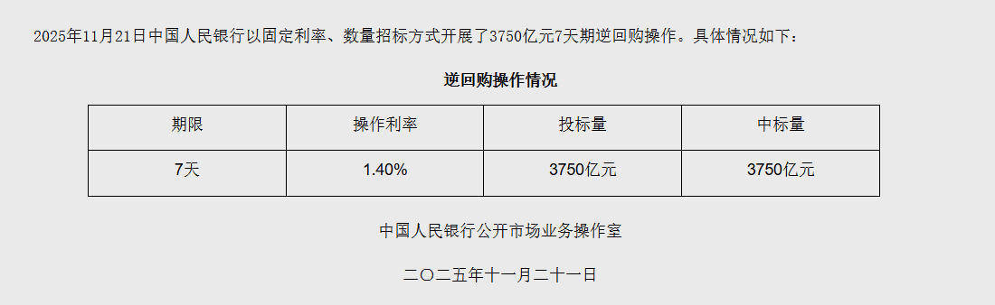 中新网11月21日电 据央行网站消息,2025年11月21日中国人民银行以固定利率、数量招标方式开展了3750亿元7天期逆回购操作。具体情况如下: