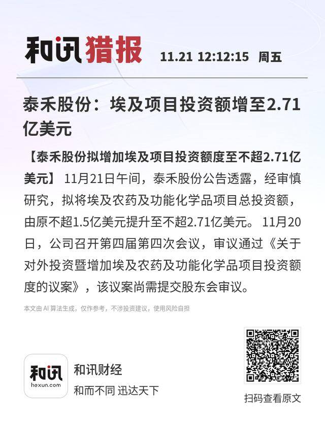【泰禾股份拟增加埃及项目投资额度至不超2.71亿美元】11月21日午间,泰禾股份公告透露,经审慎研究,拟将埃及农药及功能化学品项目总投资额,由原不超1.5亿美元提升至不超2.71亿美元。 11月20日,公司召开第四届第四次会议,审议通过《关于对外投资暨增加埃及农药及功能化学品项目投资额度的议案》,该议案尚需提交股东会审议。