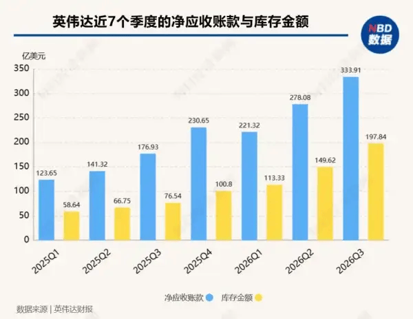 据梳理,英伟达在第三财季的应收账款已高达333.91亿美元,库存达197.9亿美元,两项数据已连续七个季度增长。相较于去年同期,应收账款增长了88.72%,库存增长了158.48%。