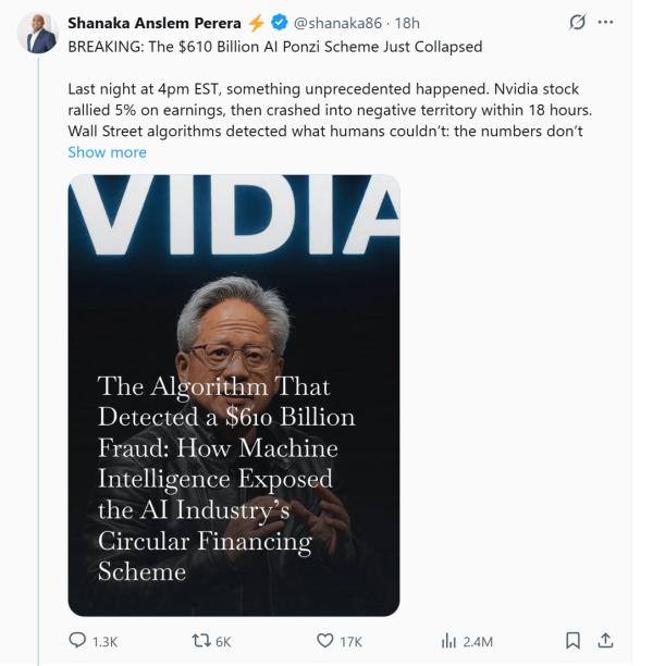 就在同日,美国金融市场独立研究员佩雷拉(Shanaka Anslem Perera)发布长文指控英伟达存在财务造假行为。其宣称,英伟达“价值6100亿美元的庞氏骗局已经崩盘”。