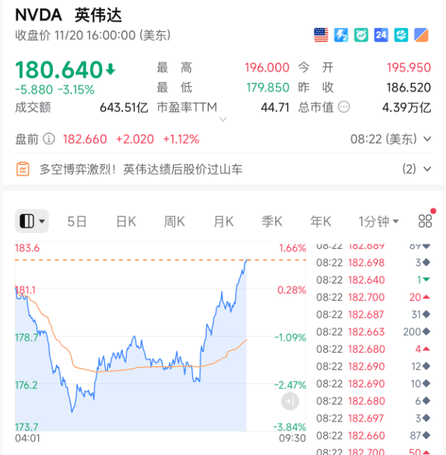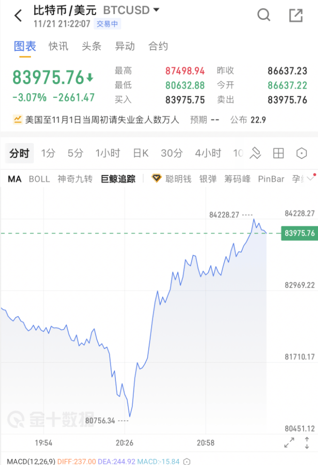 比特币从8.06万美元回升至8.4万美元。英伟达收复盘前所有跌幅,转而上涨1%。