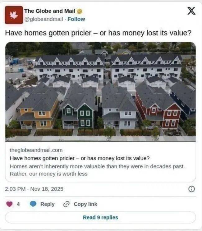 法定货币并非以黄金为支撑,其价值主要来自政府的认可。货币供应的快速扩张削弱了购买力,住房本身并未变得更贵,而是我们的货币--加元贬值了。