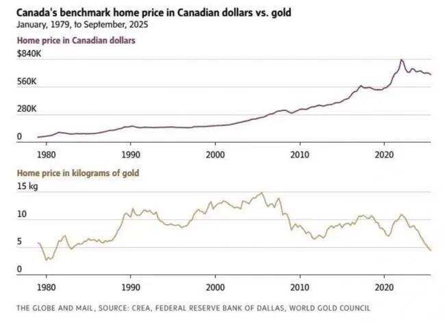 1981年,加拿大平均房价约为4.5公斤黄金;而今天,这一数字大致相同。以白银计,平均房价约为375公斤,也与1986年的水平接近。
