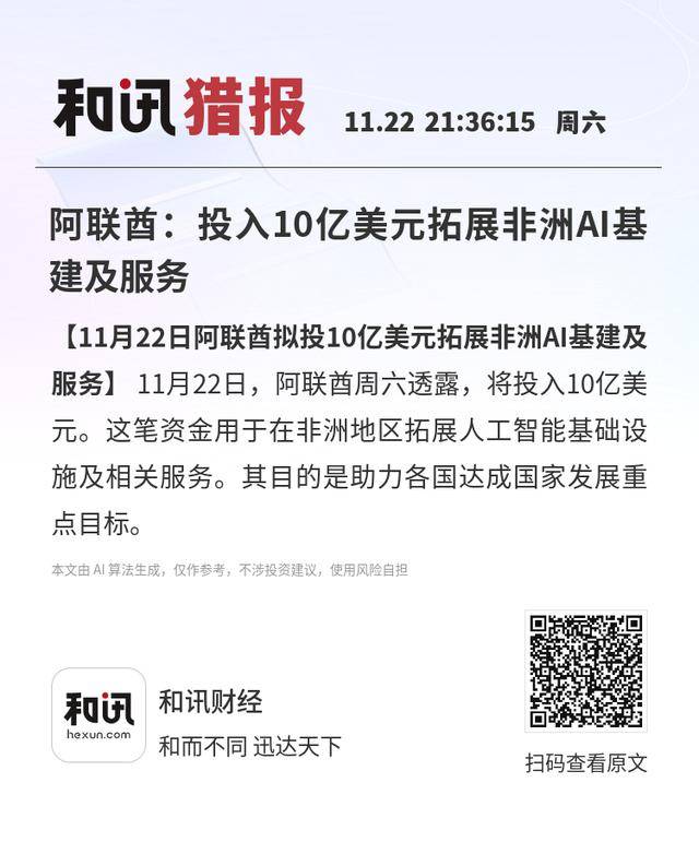 【11月22日阿联酋拟投10亿美元拓展非洲AI基建及服务】11月22日,阿联酋周六透露,将投入10亿美元。这笔资金用于在非洲地区拓展人工智能基础设施及相关服务。其目的是助力各国达成国家发展重点目标。
