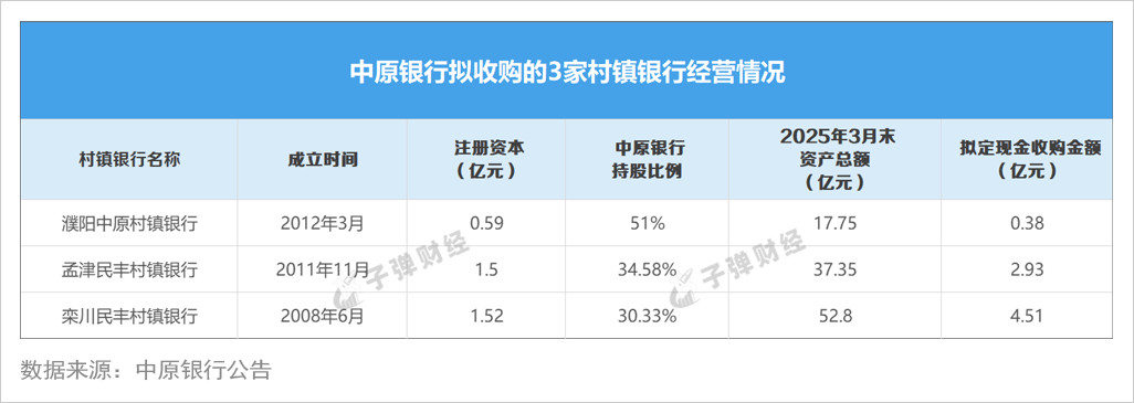 据中原银行发布的公告,该行拟采用现金方式,收购濮阳、孟津、栾川三家村镇银行的其他股东分别持有的0.29亿股、0.98亿股和1.06亿股股权。