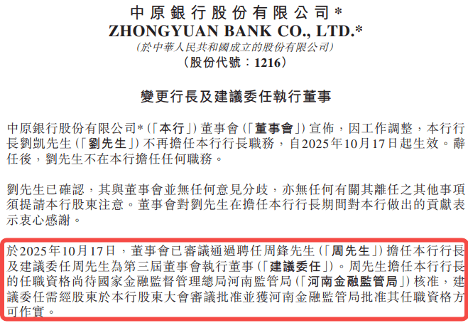 10月17日,中原银行发布公告称,原行长刘凯辞去该行执行董事、副董事长及行长等一切职务。同日,河南省政府发布一则通知,任命河南省政府原副秘书长周锋担任中原银行行长、副董事长职务,其任职资格尚待监管批复。