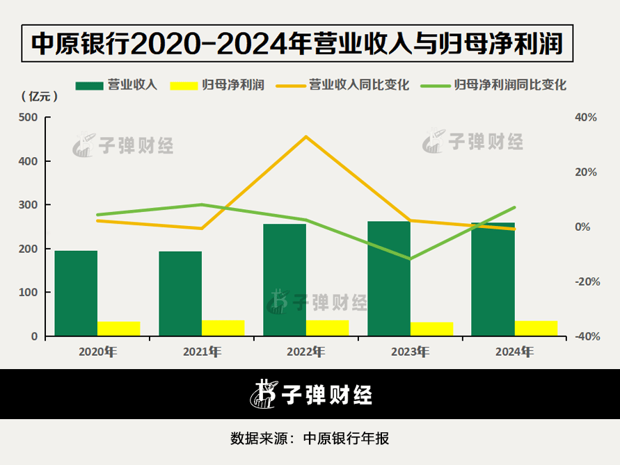 2020年至2024年,中原银行的营业收入同比增速分别为2.1%、-0.7%、32.8%、2.2%和-0.9%,其中有两年的营收回落但降幅均在1%以内。