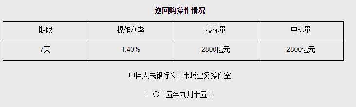 中新网9月15日电 据央行网站消息,2025年9月15日中国人民银行以固定利率、数量招标方式开展了2800亿元逆回购操作。具体情况如下: