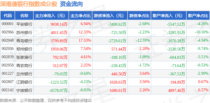 资金流向方面,深港通银行(983081)指数成份股当日主力资金净流入合计1.2亿元,游资资金净流出合计3645.02万元,散户资金净流出合计8387.9万元。成份股资金流向详情见下表: