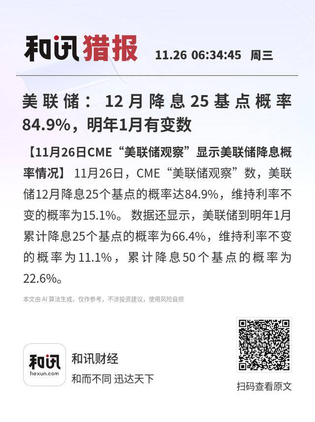 【11月26日CME“美联储观察”显示美联储降息概率情况】11月26日,CME“美联储观察”数,美联储12月降息25个基点的概率达84.9%,维持利率不变的概率为15.1%。数据还显示,美联储到明年1月累计降息25个基点的概率为66.4%,维持利率不变的概率为11.1%,累计降息50个基点的概率为22.6%。