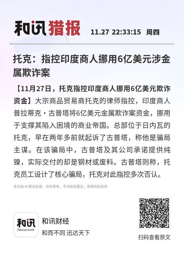 【11月27日,托克指控印度商人挪用6亿美元欺诈资金】大宗商品贸易商托克的律师指控,印度商人普拉蒂克·古普塔将6亿美元金属欺诈案资金,挪用于支撑其陷入困境的商业帝国。总部位于日内瓦的托克,早在两年多前就起诉了古普塔,称他是骗局主谋。在该骗局中,古普塔及其公司承诺提供纯镍,实际交付的却是钢材或废料。古普塔则称,托克员工设计了核心骗局,托克对此指控多次否认。