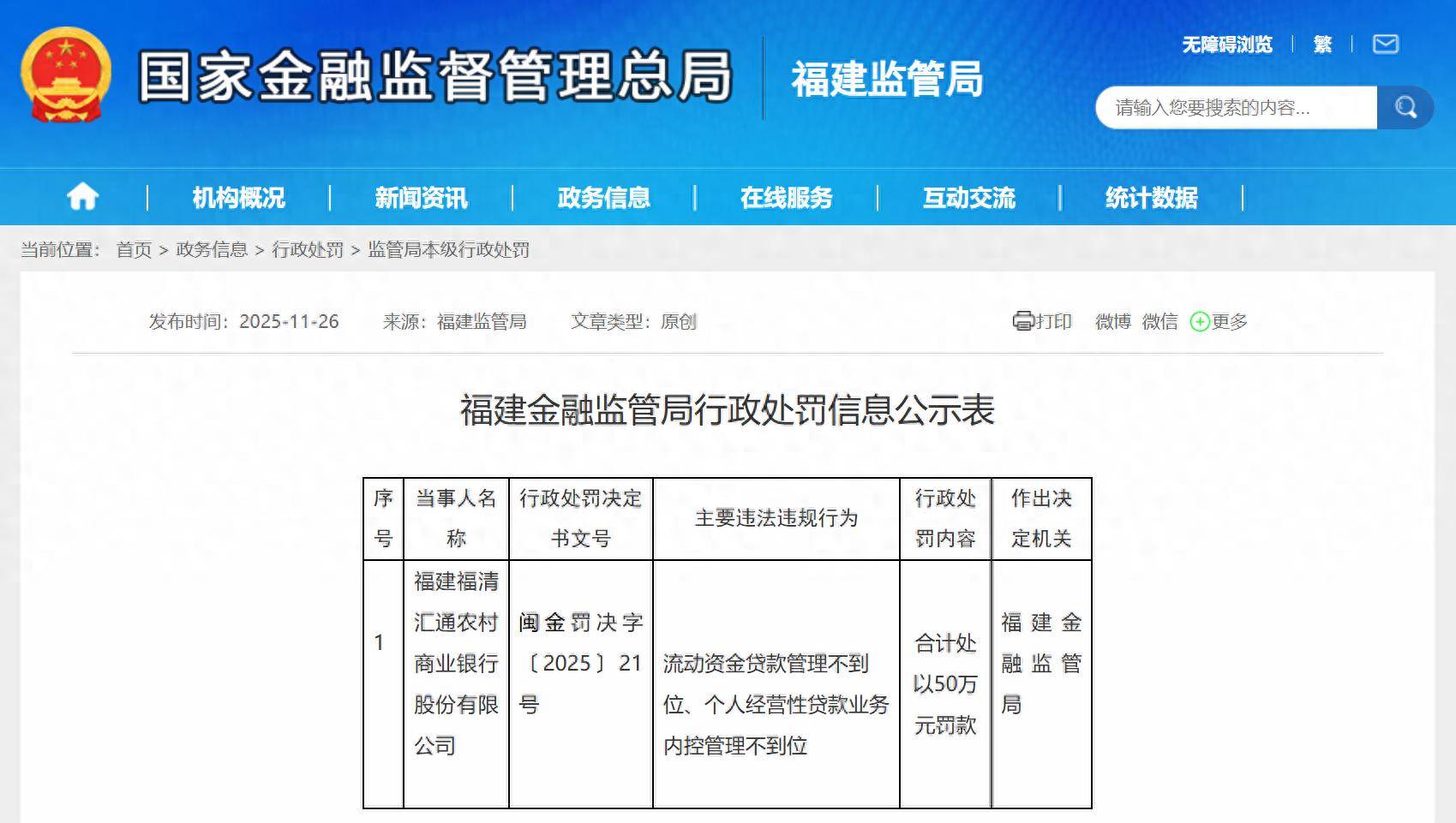 11月26日,据福建金融监管局行政处罚信息公开表显示,福建福清汇通农村商业银行股份有限公司(简称“福清汇通农商银行”) 因流动资金贷款管理不到位、个人经营性贷款业务内控管理不到位,被合计处以50万元罚款。