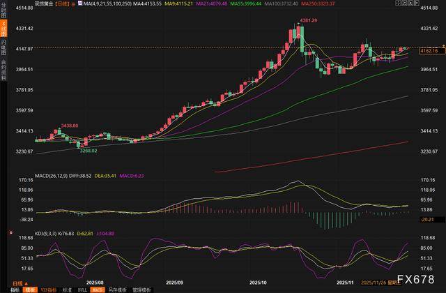汇通财经APP讯——周五(11月28日)亚市早盘,现货黄金窄幅震荡,目前交投于4163美元/盎司附近,犹如一艘稳健的航船,守在近两周的高位。尽管周四小幅回落至4157.22美元/盎司,跌幅仅约0.16%,但距离前一日创下的4173美元两周高点仅一步之遥。投资者们正密切关注美国12月降息的可能性,而这一预期已成为支撑金价的关键力量。自10月20日触及历史高点4381.21美元以来,金价虽累计下跌5%,但始终维持在4000美元以上的关键水平之上,显示出强劲的韧性。