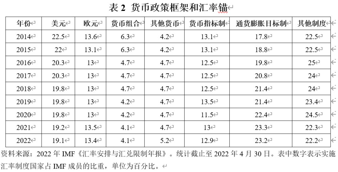3. 货币锚。货币锚是指货币当局为实现其政策目标而追求的主要中间目标(以物价稳定为主),包括汇率锚、货币指标制、通货膨胀目标制等。具体而言:其一,汇率锚(Exchange rate anchor)是指货币当局通过买卖外汇使汇率维持在预定水平或一定范围内。汇率是货币政策的名义锚或中间目标。一国官方宣布使用固定汇率政策(无论是硬挂钩还是软挂钩)便意味着其使用汇率作为独特的货币锚。当前,美元被全球主要国家选为货币锚,但比重有所下降。选择美元作为汇率锚的国家比重从2014年的22.5%下降至2022年的13.4%。欧元作为全球第二大汇率锚,2022年占比为13.4%(见表2)。其二,货币指标制(Monetary aggregate target)是指货币当局使用政策工具来实现一个货币总额的目标增长率,如储备货币、M1或M2。货币指标制将成为货币政策的名义锚点或中间目标。截止至2022年4月,有25个国家以货币总量为锚,该类别不包括任何采取自由浮动汇率制度的国家。其三,通货膨胀目标制(Inflation-targeting framework)包括公开宣布通货膨胀目标,以及由货币当局提出的机构承诺来实现通货膨胀目标,通常是在中期范围内。货币政策决策往往以未来通胀预测偏离宣布的通胀目标为指导,通货膨胀预测(含蓄或明确地)作为货币政策的中间目标。截止至2022年4月,有45个国家实行通货膨胀目标制。该类国家多为中等收入国家,也包括一些发达经济体。其中,37个采取事实上的浮动或自由浮动汇率制度。其四,其他制度(Other)是指该国没有明确规定名义货币锚,而是在执行货币政策时监测各种指标。当前,该类国家中的部分国家正在向通货膨胀制过渡(例如埃及、蒙古、莫桑比克、巴基斯坦、突尼斯)。