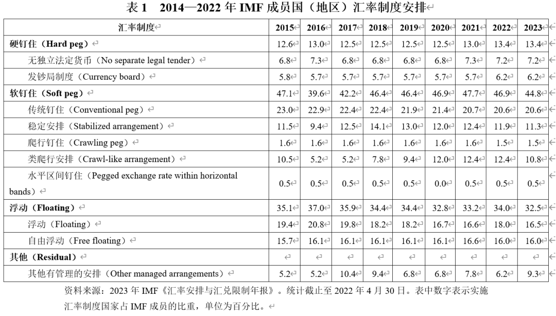 2. 汇率制度的分类。总体而言,汇率制度可以分为固定汇率制和浮动汇率制。IMF根据各国汇改实践,对汇率制度进一步细分为硬钉住、软钉住和自由浮动。2014年至2022年,全球主要国家实行软盯住汇率制度,其次为浮动汇率制度,少数国家实行其他有管理的安排(见表1)。在其中,软钉住和自由浮动汇率制度根据是否存在中间汇率、中间汇率可变还是不可变、围绕中间汇率是否有个波动区间等特点,可细分为多种不同汇率制度(余永定和肖立晟,2017)。根据IMF的汇率制度分类,人民币汇率制度被归类为类爬行安排(Crawl-like arrangement)。