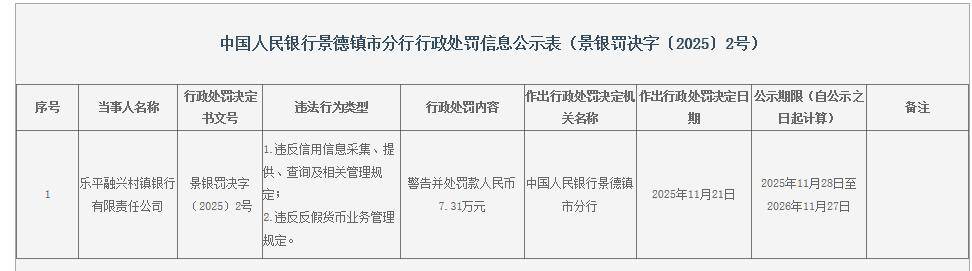 中国经济网北京11月30日讯 中国人民银行景德镇市分行近日公布的行政处罚信息公示表(景银罚决字〔2025〕2号)显示,乐平融兴村镇银行有限责任公司违反信用信息采集、提供、查询及相关管理规定;违反反假货币业务管理规定。中国人民银行景德镇市分行对其警告并处罚款人民币7.31万元。