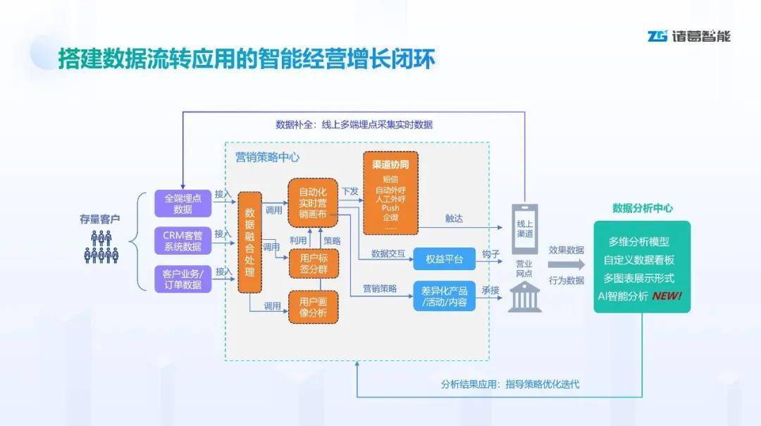 诸葛智能搭建智能经营闭环,以“业务场景”为核心,将客户洞察、客群划分、策略配置、触达执行、效果回流等环节全部统一在一个经营框架下,使得银行能够以连续、可复用、可沉淀的方式开展营销。