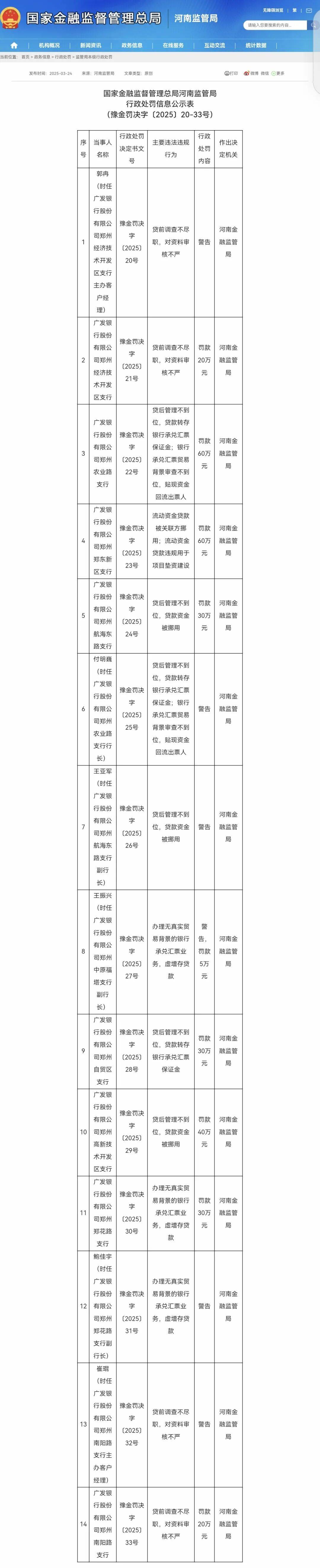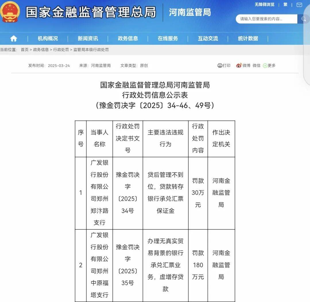 而在此之前,广发银行股份有限公司郑州分行的问题尤为集中——其下属10家支行,因涉及无真实贸易背景票据业务、贷款资金被挪用等问题,被合计罚款500万元。