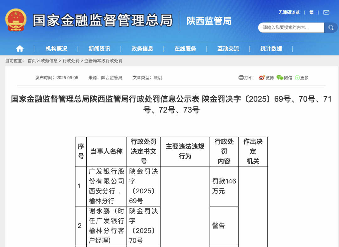 在分支机构层面,广发银行中山、西安、榆林等分行今年同样因违规受罚。