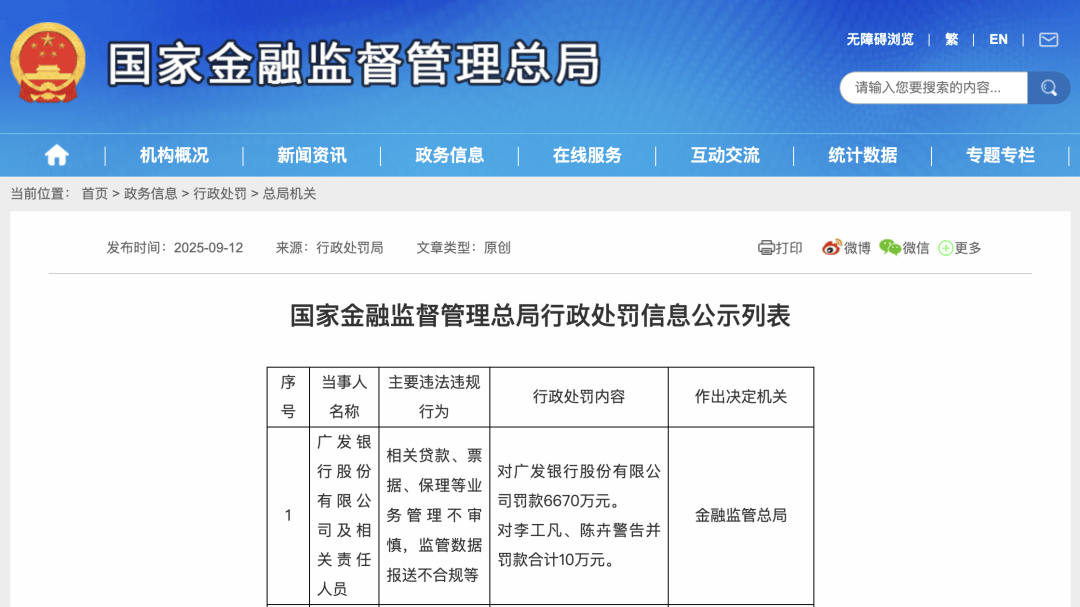 9月12日,国家金融监督管理总局行政处罚信息公示列表显示,广发银行股份有限公司因相关贷款、票据、保理等业务管理不审慎,监管数据报送不合规等,被金融监管总局处以罚款6670万元。
